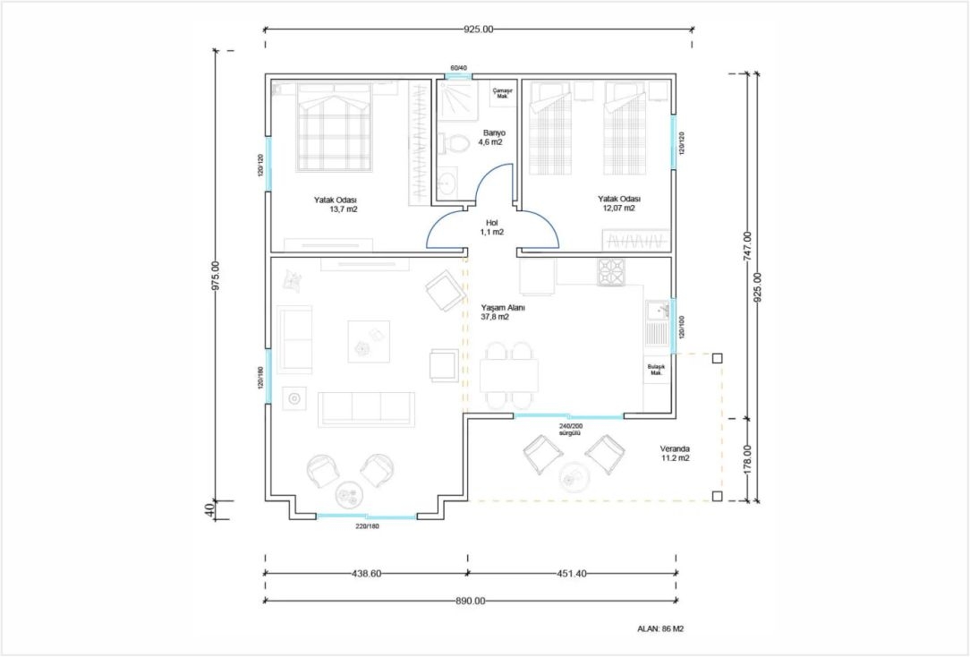 86 m² Modern ve Fonksiyonel Yaşam Alanı