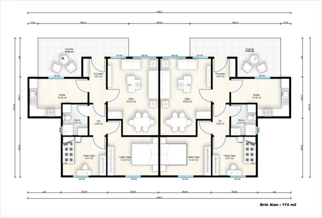 Toplam Brüt Alan: 174 m²
