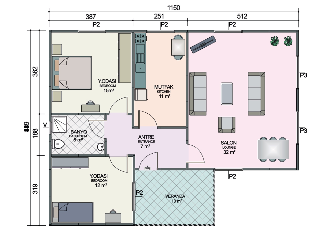 83 + 10 m2 veranda tek katlı prefabrik konut