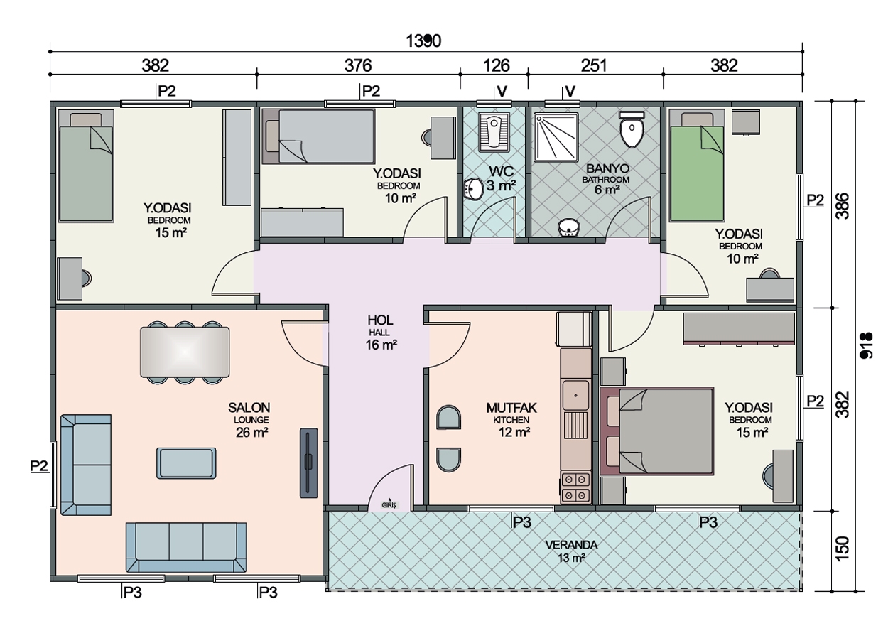 113 + 13 m 2 veranda tek katlı prefabrik konut